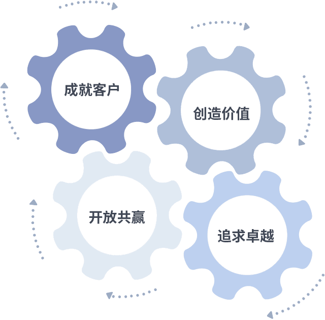 成就客户是一切决策的出发点,,,,创造价值是衡量所有工作的标准,,,,追求卓越是我们做事做人的态度,,,,开放共赢是我们的格局也是最终的结果。。价值观的齿轮环环相扣,,推动着组织里的每个人不断向前。。。。